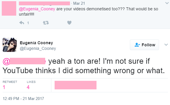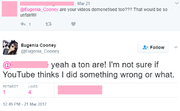 | 07:08, 25 March 2017 | DemonetizeEugeniasVideos.png (file) | 36 KB | Admin | Many of Eugenia's videos were demonetized after YouTube took away monetization on videos mentioning her, March 2017 | 1 | |