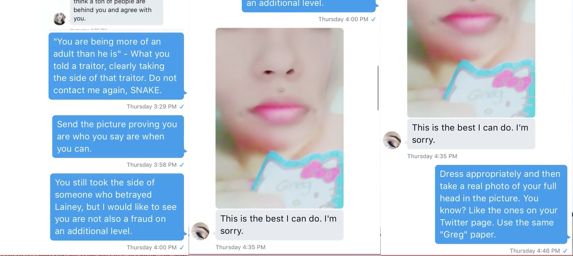 | 07:44, 26 March 2017 | EOAdminDox.jpg (file) | 61 KB | Admin | admin of eoliveson says Greg's fans are doxing them and they are willing to delete their blog if Greg takes his catfish video down, January 2017 | 1 | |