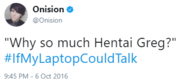 | 05:31, 13 October 2017 | HentaiTweet.png (file) | 19 KB | Admin | 6 Oct 2016 "Why so much Hentai Greg?" | 1 | |
