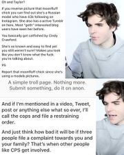 | 18:22, 25 March 2017 | CatfishThumbnailCensored.png (file) | 1.23 MB | Admin | "CATFISH Attempt on Lainey & Onision (By Cringey Hate Blogger)" Jan 23, 2017 - Face blocked by LoO admin | 1 | |
