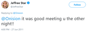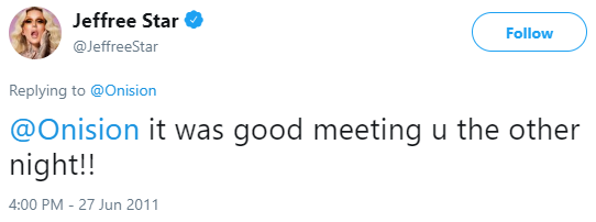 | 14:06, 20 August 2018 | JeffreeTweet2011.png (file) | 23 KB | Admin | Jeffree tweets @Onision it was good meeting u the other night!! June 27, 2011 | 1 | |