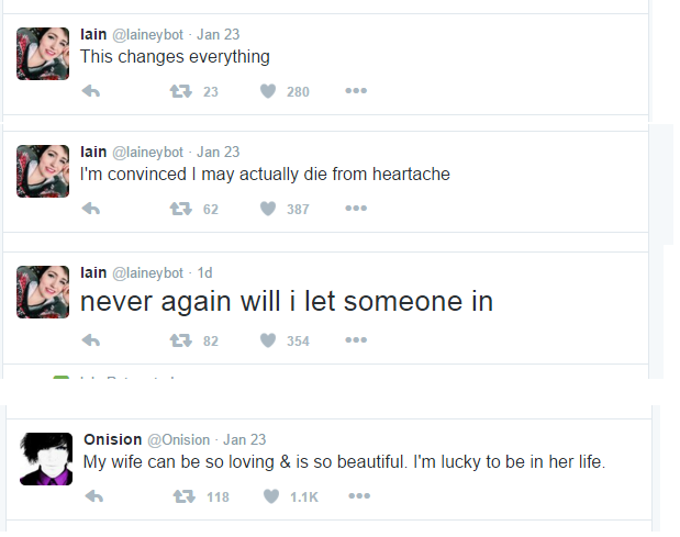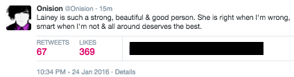 | 10:02, 5 March 2019 | LaineyGregBreakup1-23-16.png (file) | 51 KB | Admin | Lainey and Greg hint at their break up on twitter before announcing it two days later, January 23, 2016 | 1 | |