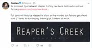 | 12:15, 17 August 2018 | Reapers Don't Read Patreon.png (file) | 281 KB | Admin | Greg responds to Reaper's Creek criticism on Patreon February 12, 2018 | 1 | |