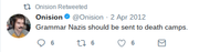 | 12:39, 17 August 2018 | Reapers Death Camp.png (file) | 15 KB | Admin | Greg tweeting grammar Nazis should be sent to death camps in response to criticism of his book Reaper's Creek February 12, 2018 | 1 | |