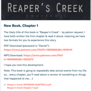 | 11:51, 17 August 2018 | Reaper Chapter1.png (file) | 159 KB | Admin | Reaper's Creek's first chapter announcement on Patreon. January 28, 2018 | 1 | |