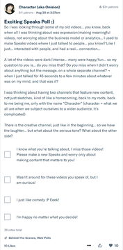 | 07:42, 19 September 2018 | SpeaksPoll.png (file) | 131 KB | Admin | Patreon poll asking if fans want a new Speaks channel, created Character Vlogs the next day August 30, 2018 | 1 | |
